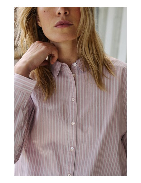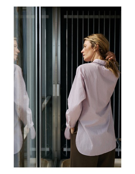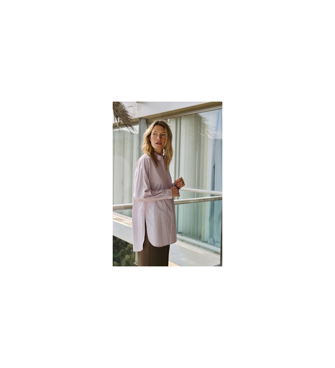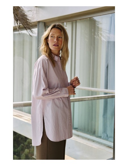 Esta camisa larga de popelín a rayas es un básico que todas deberíamos tener en nuestro armario. Con cuello camisero, hombro caído y aberturas laterales.