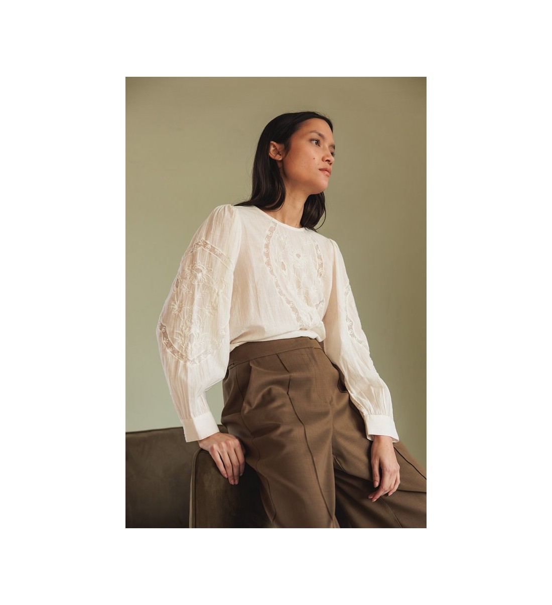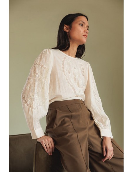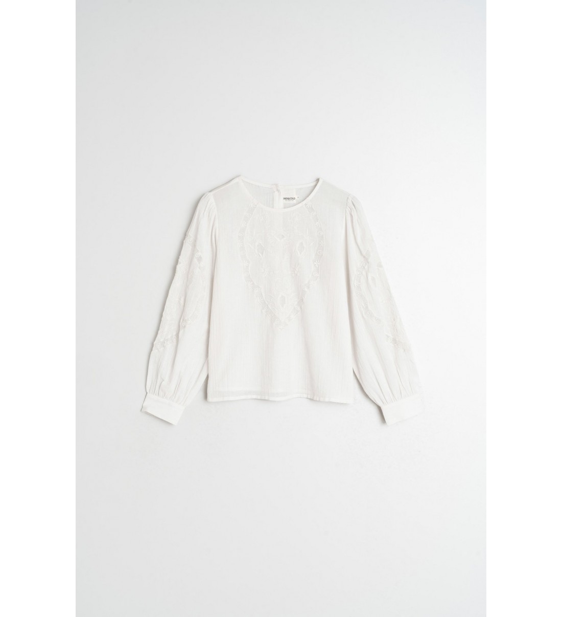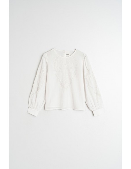 Blusa con cuello redondo y cierre de lágrima y botón en la parte trasera. Tiene bordados de motivo floral trabajado sobre una base de red, una prenda especial que dará un toque sofis a tus looks este invierno.