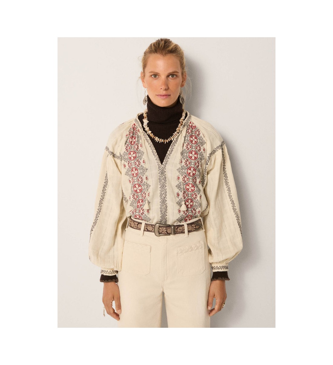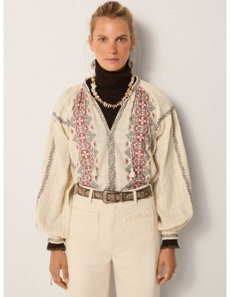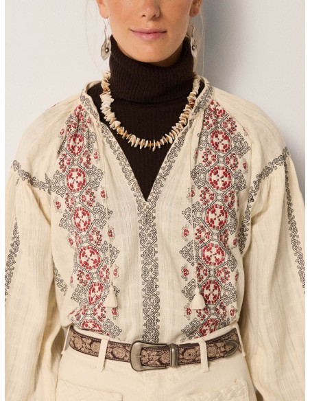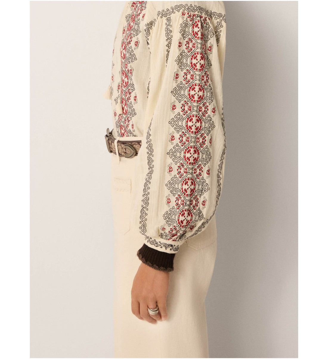 Un bordado integral recorre el corpiño y las mangas con motivos geométricos y llamativos en negro y carmesí. El bordado se asemeja a paneles tejidos, creando ritmo y contraste en toda la superficie.