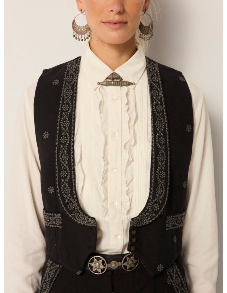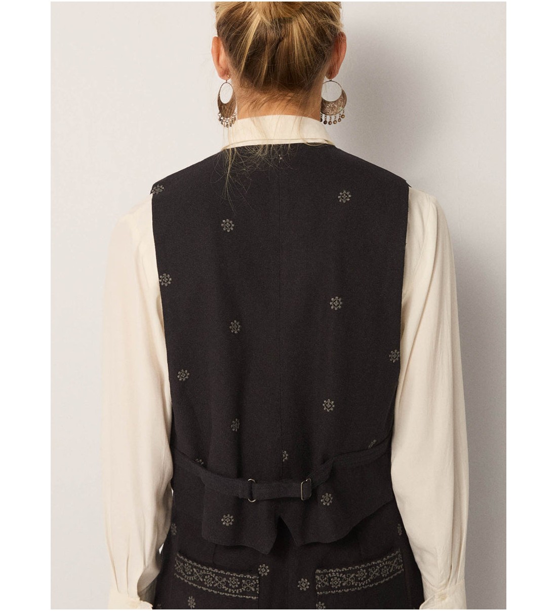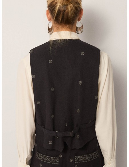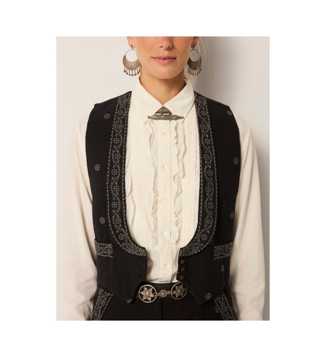 Combinado con la camisa Clara Pearl y el pantalón Diego, y rematado con un cinturón Bobby Onix, el look crea un efecto de traje en capas cohesivo. El chaleco también queda bien con un vestido negro ajustado, aportando textura y profundidad sin eclipsar.