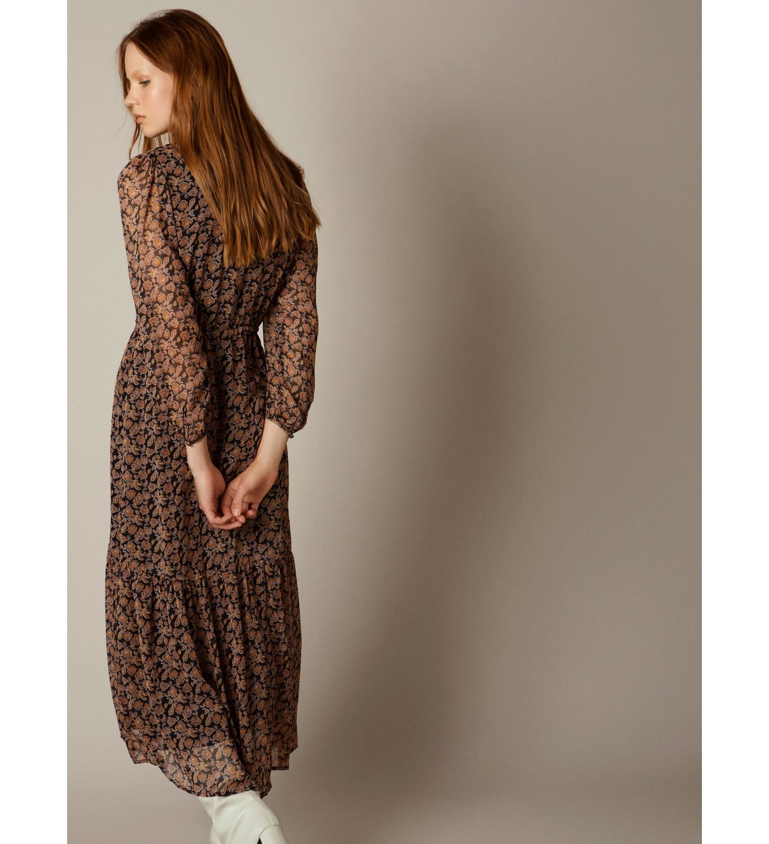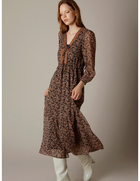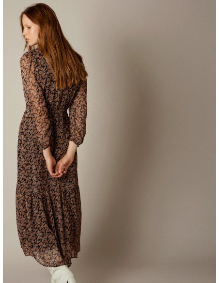 Vestido largo gasa estampado pasley detalle fornitura rayas gold
