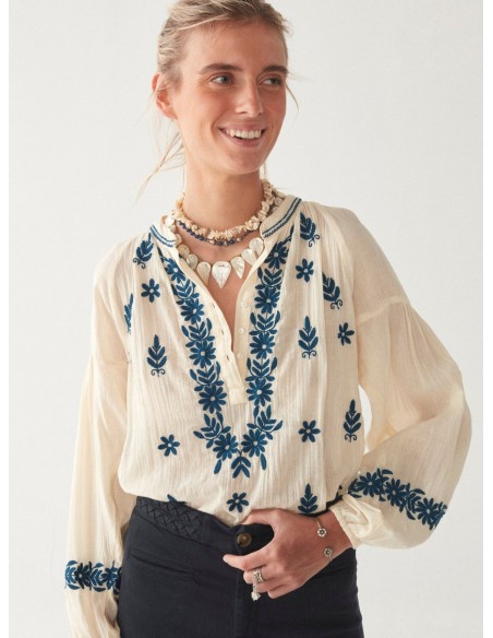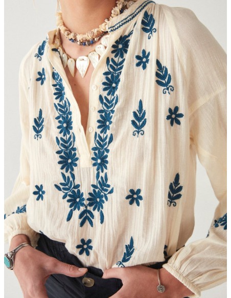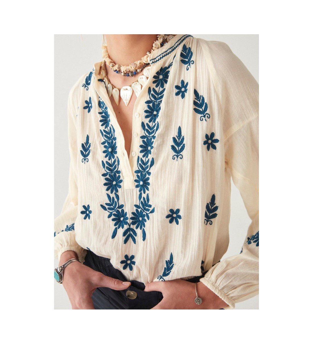 Confeccionada en nuestra distintiva gasa de algodón súper suave, la blusa con medio botón resalta un intrincado bordado floral en el pecho y en la parte inferior de las mangas, y un bordado de motivos y flores en toda la blusa. Acabado con un detalle de bordado en el borde en el escote.