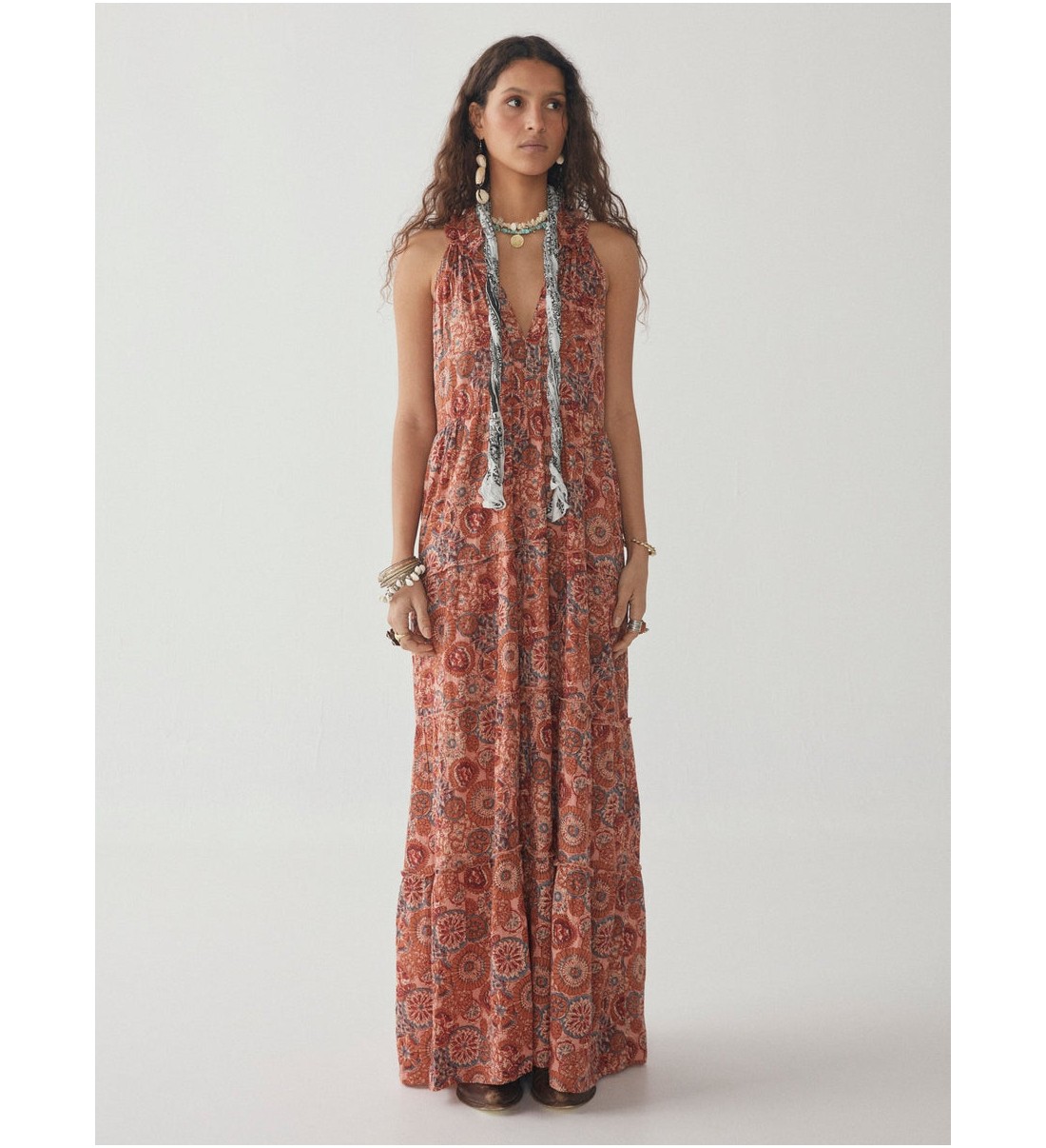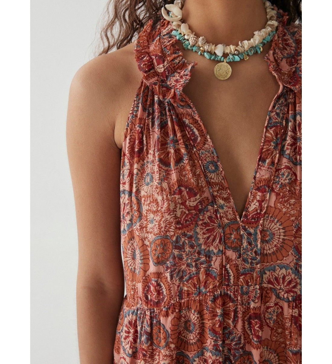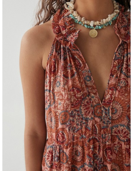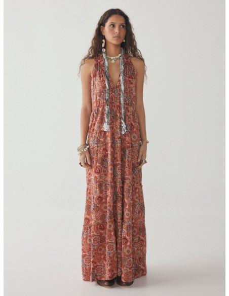 El vestido largo sin mangas viene completamente forrado y presenta múltiples cortes y fruncidos en la parte inferior, lo que le da ese aspecto bohemio verdaderamente aireado. Prueba a coger unas sandalias de cuero vintage para combinar.