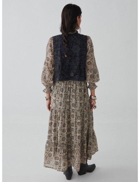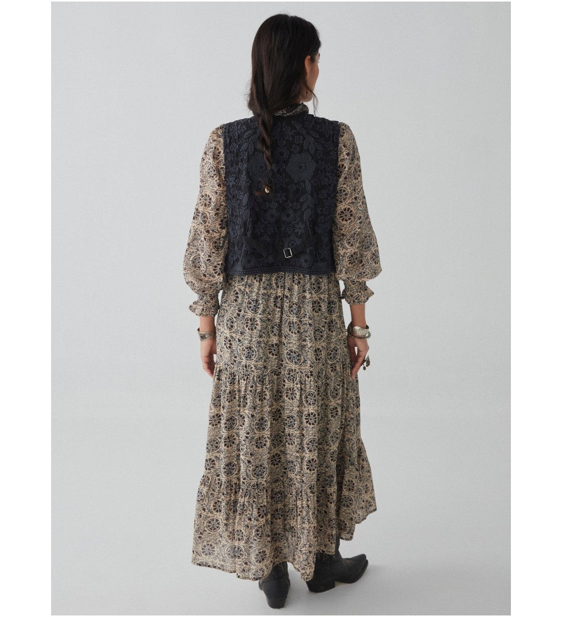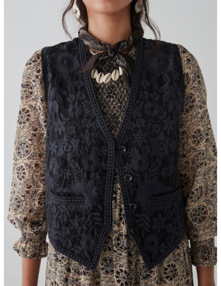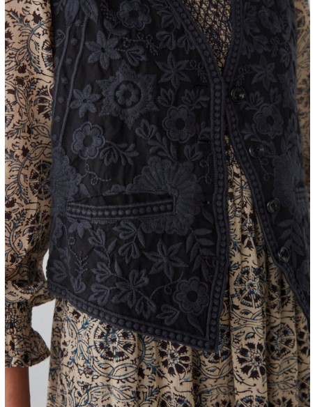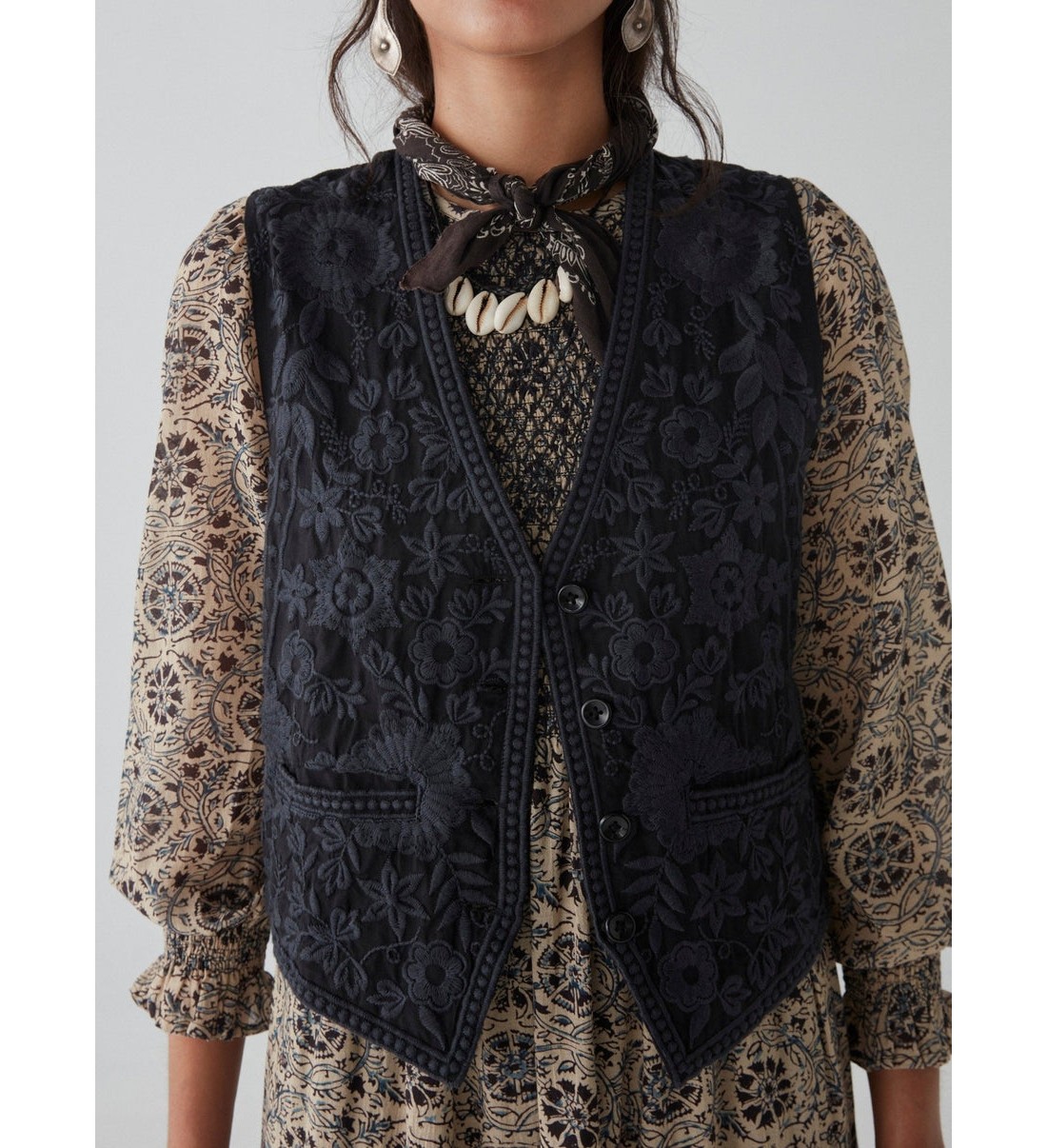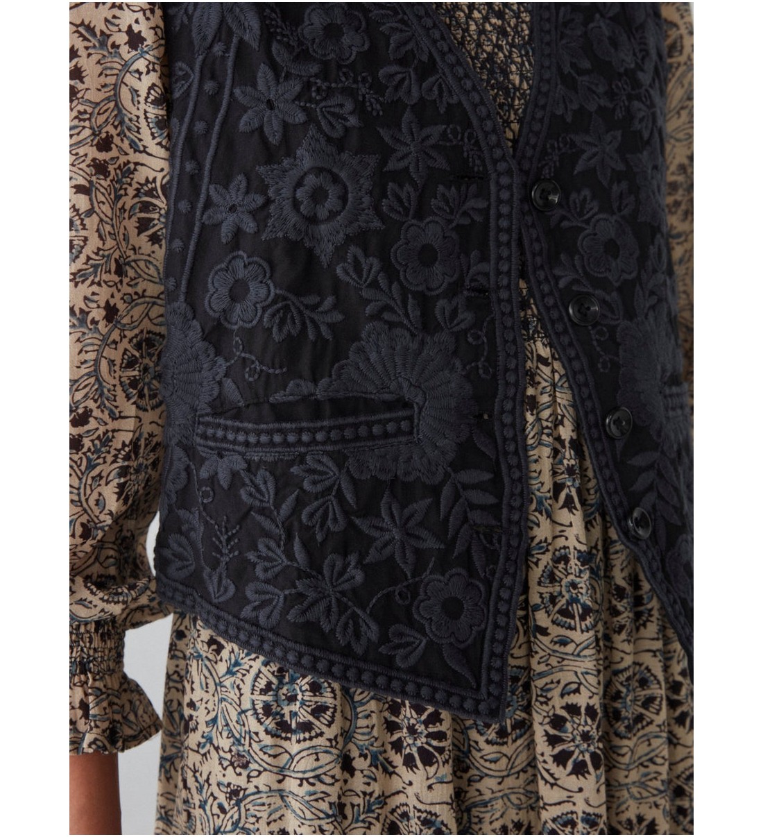 Nuestro chaleco de lona de algodón Freddie "combinable con todo" presenta un bordado floral gris desgastado de un solo tono en todo su perímetro y un bordado con borde étnico en los bordes.
