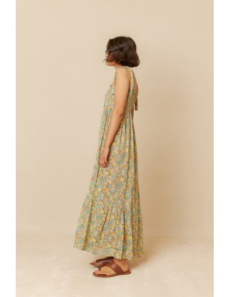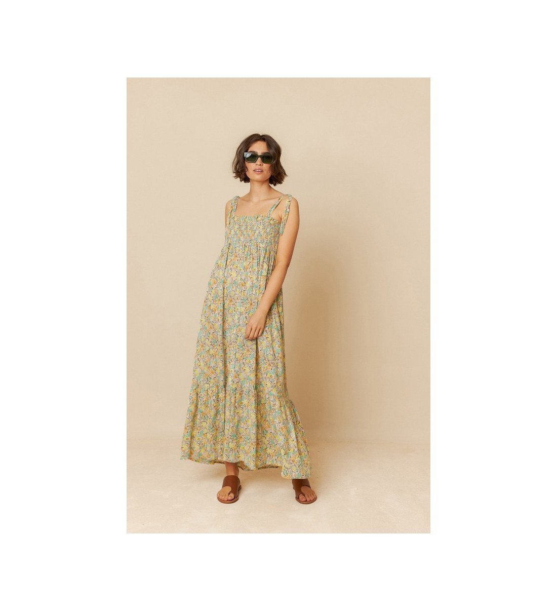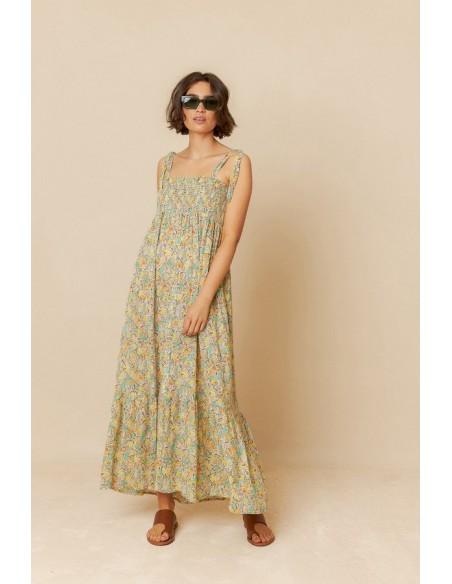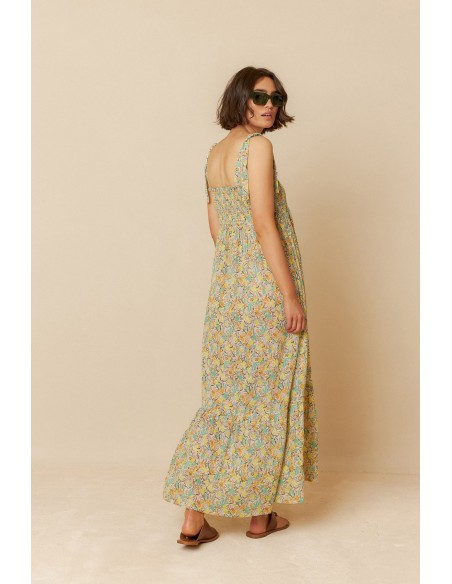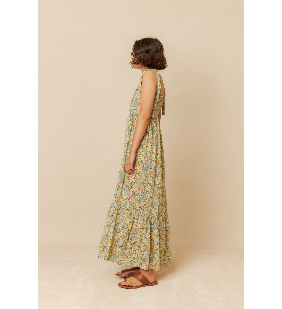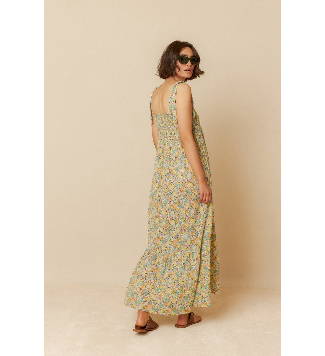 Este maxi vestido es una prenda muy versátil. Con un escote cuadrado y tirante ajustable mediante lazada, se adapta a tu estilo personal. Su corte de pecho engomado y el tejido con print digital de flores abstractas hacen de esta prenda una opción especial. Con un fit relajado, diseñado para que siente ligeramente holgado, es perfecto para un look veraniego.