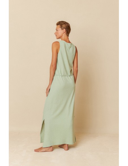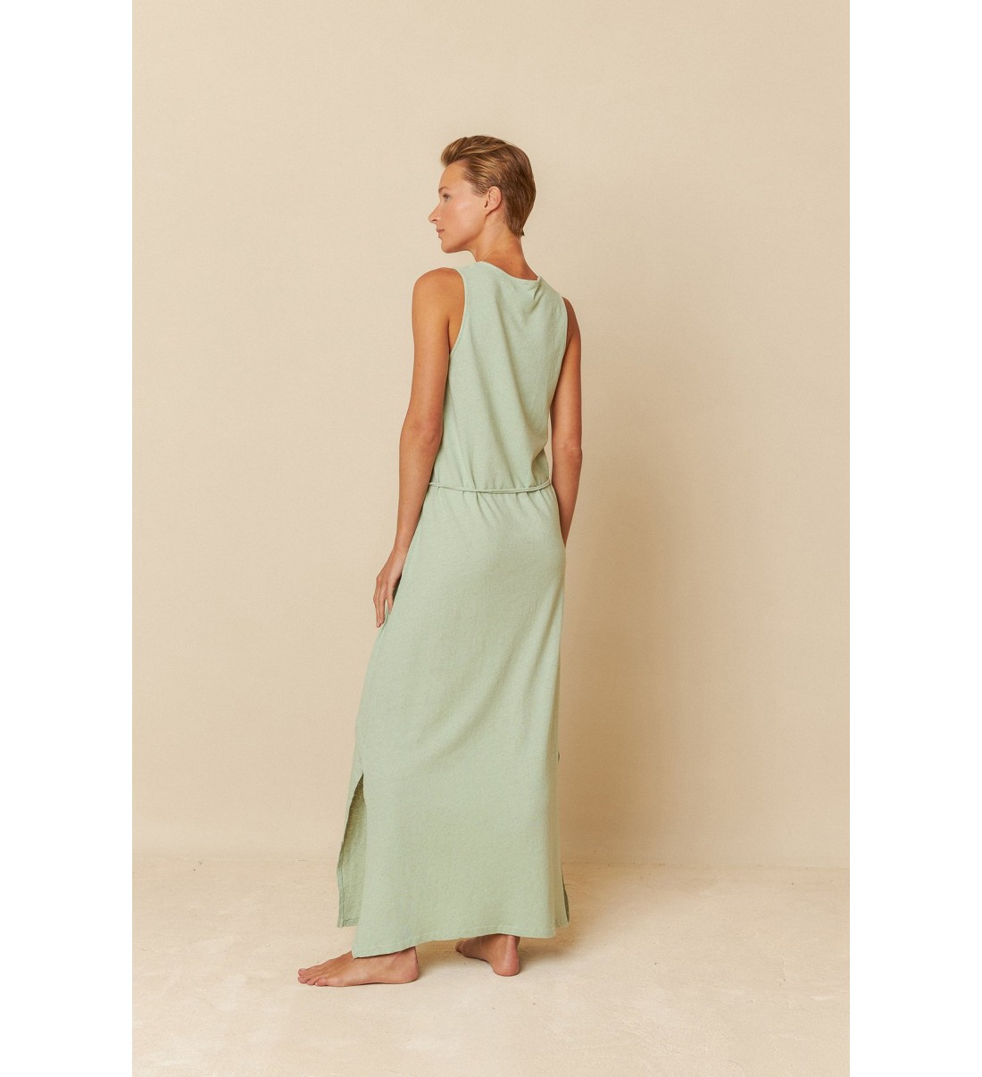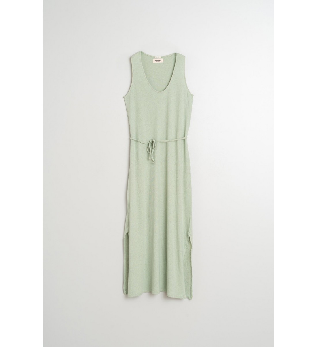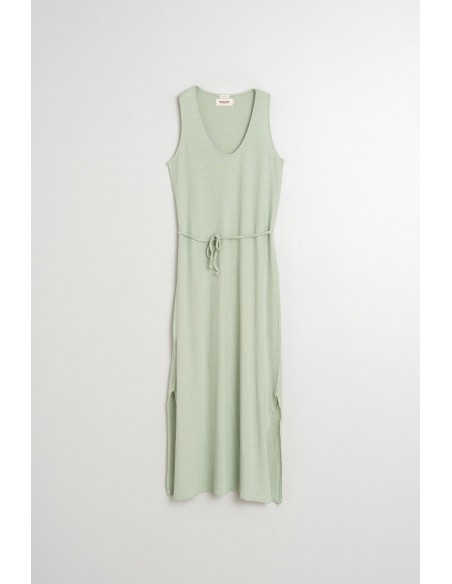 ste vestido es de algodón y lino y es Made in Spain. Además, su fit es relajado, tiene aberturas laterales, hombro encajado y cintura ajustable con cinturón extraíble.