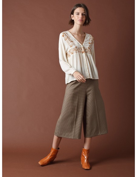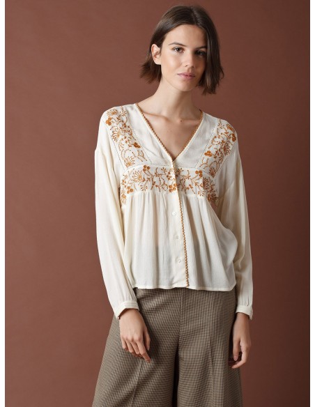 CAMISA FLUIDA CON ESCOTE EN V Y BORDADOS A CONTRASTE.
