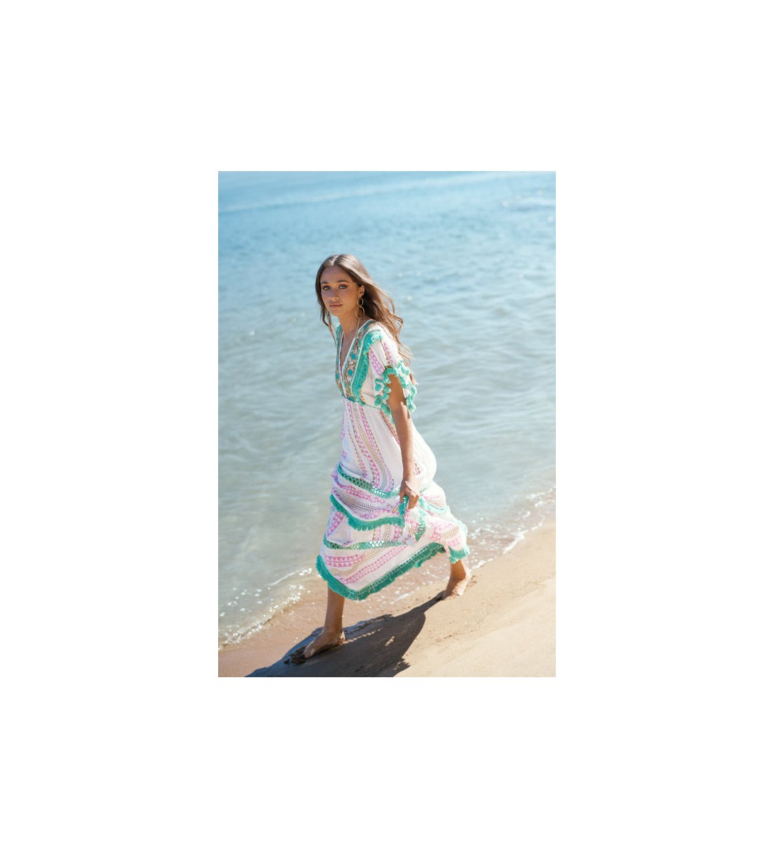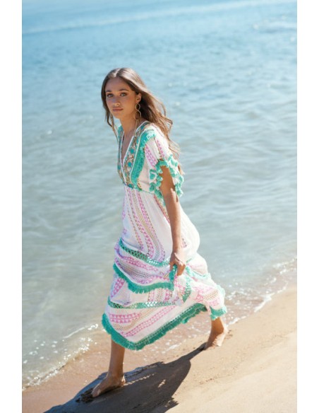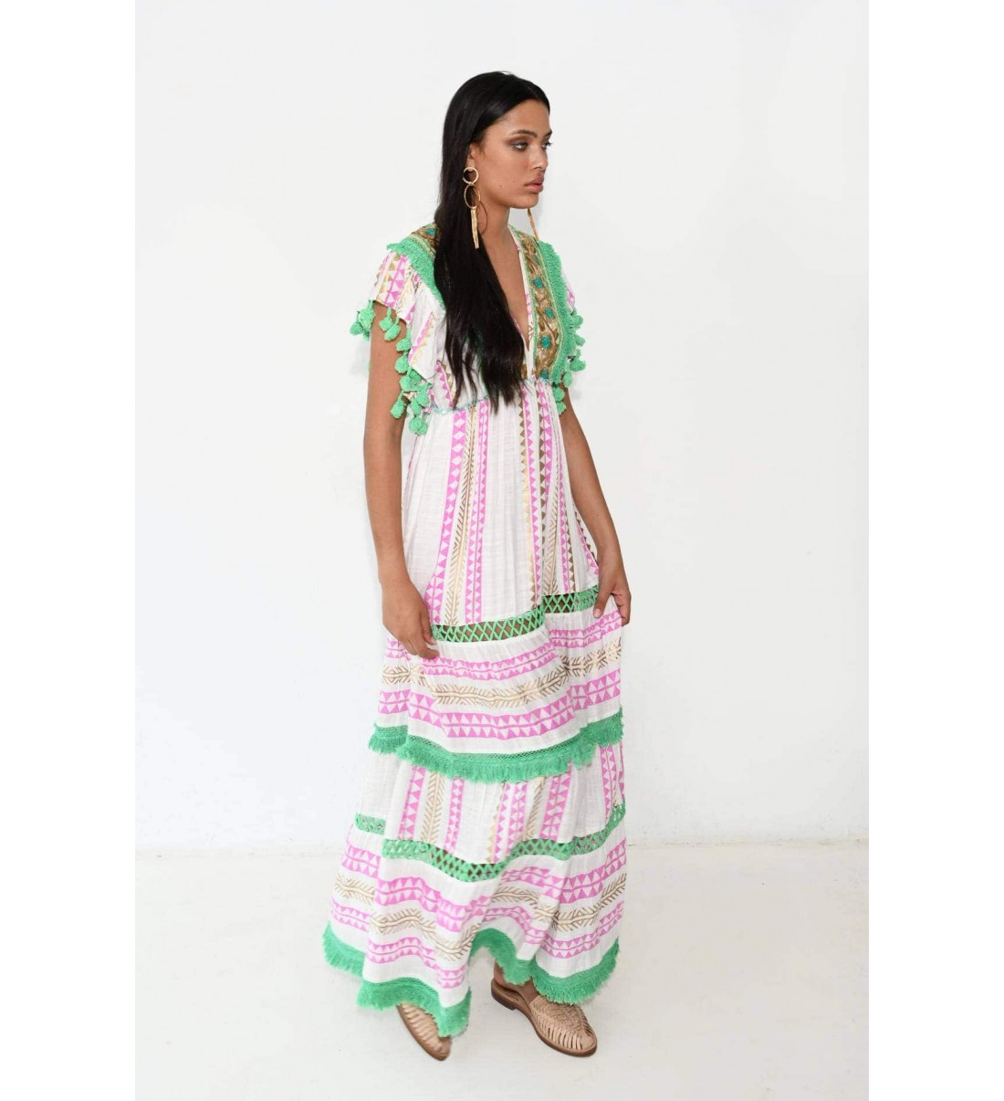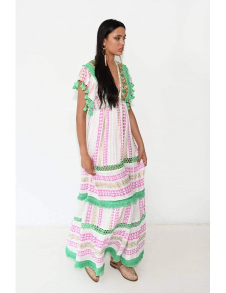 Este vestido evoca vibraciones bohemias con su paleta de colores rosados, verdes y blancos. Los detalles de pompones verdes dan un toque alegre, mientras que las líneas verticales estilizan la figura. La combinación de patrones geométricos y franjas da un aire folk. Es perfecto para un día al aire libre o una reunión casual. Las mangas y el borde inferior con volantes lo hacen dinámico y fresco.