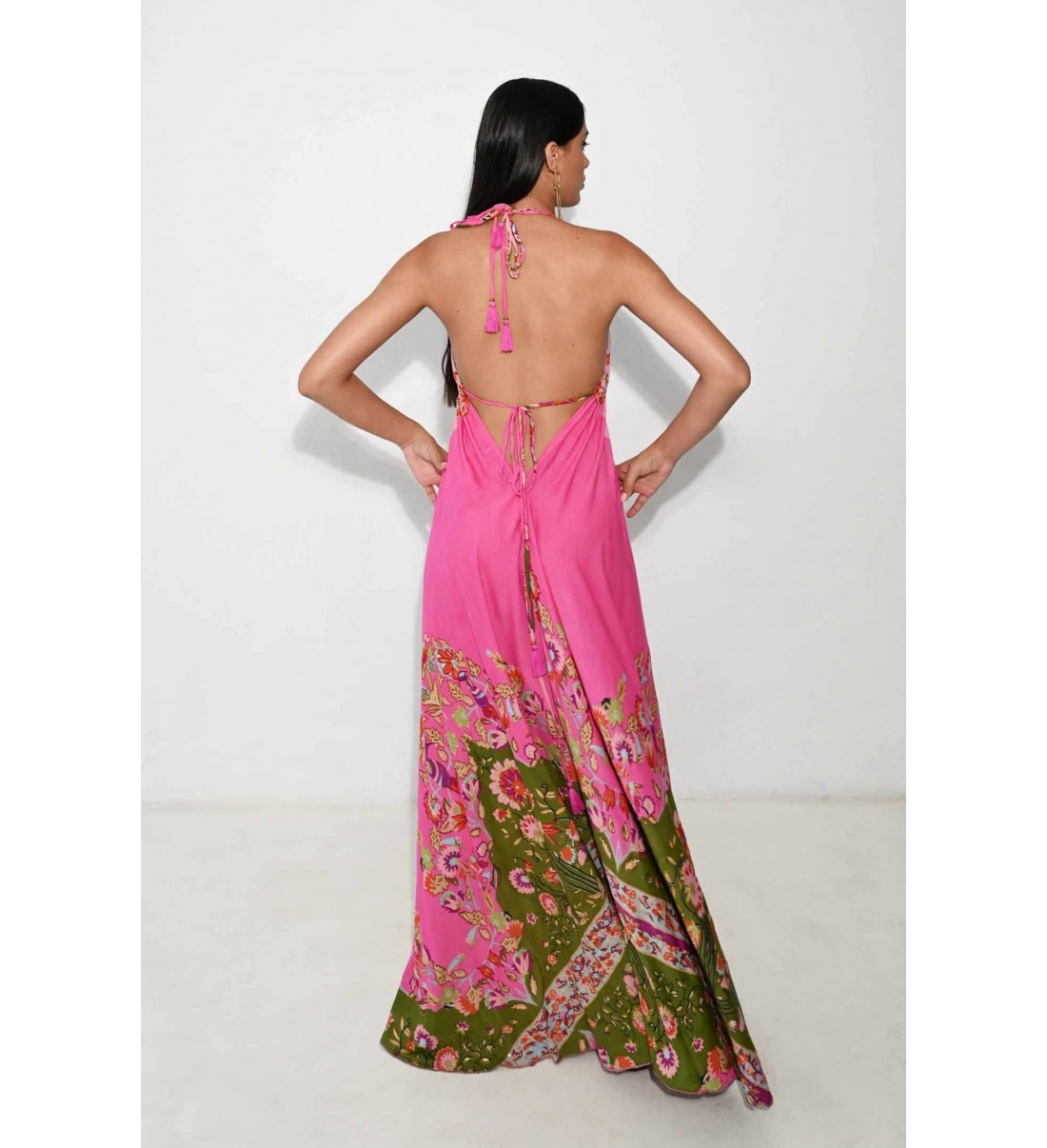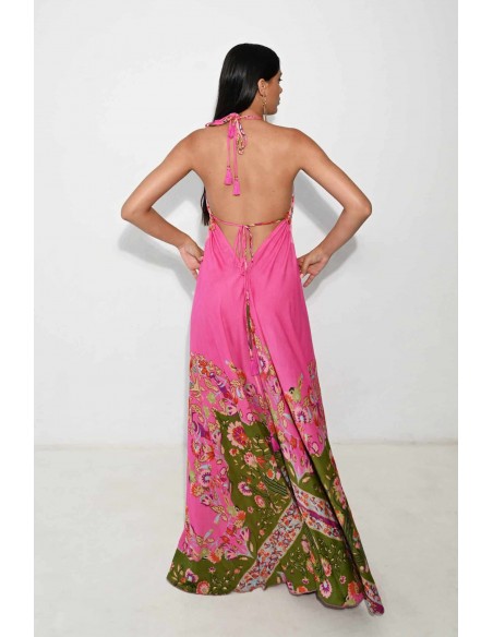 Elegancia y sofisticación con el vestido Lucia, inspirado en la serenidad y belleza de los jardines floridos. Este vestido, en un cautivador tono rosa, se adorna con intrincados patrones florales que dan vida a cada pliegue. El diseño halter con escote en V y su espalda abierta ofrecen un equilibrio entre lo clásico y lo contemporáneo. La caída fluida de la falda hasta el suelo invita a un movimiento grácil con cada paso. Ideal para eventos al aire libre o cenas especiales. Completa el look con sandalias doradas y joyería sutil para un aire de gracia inigualable