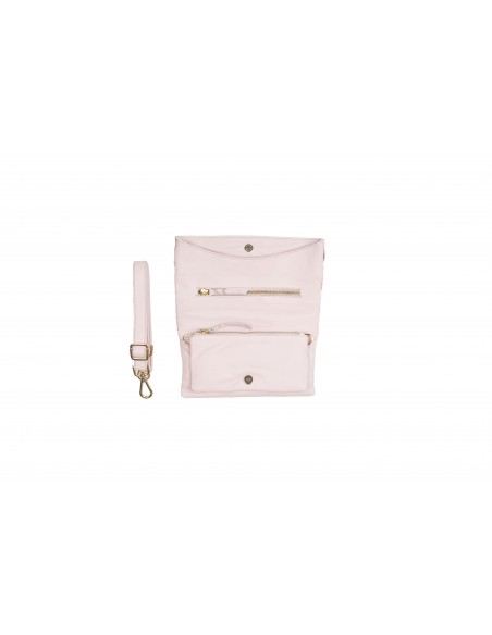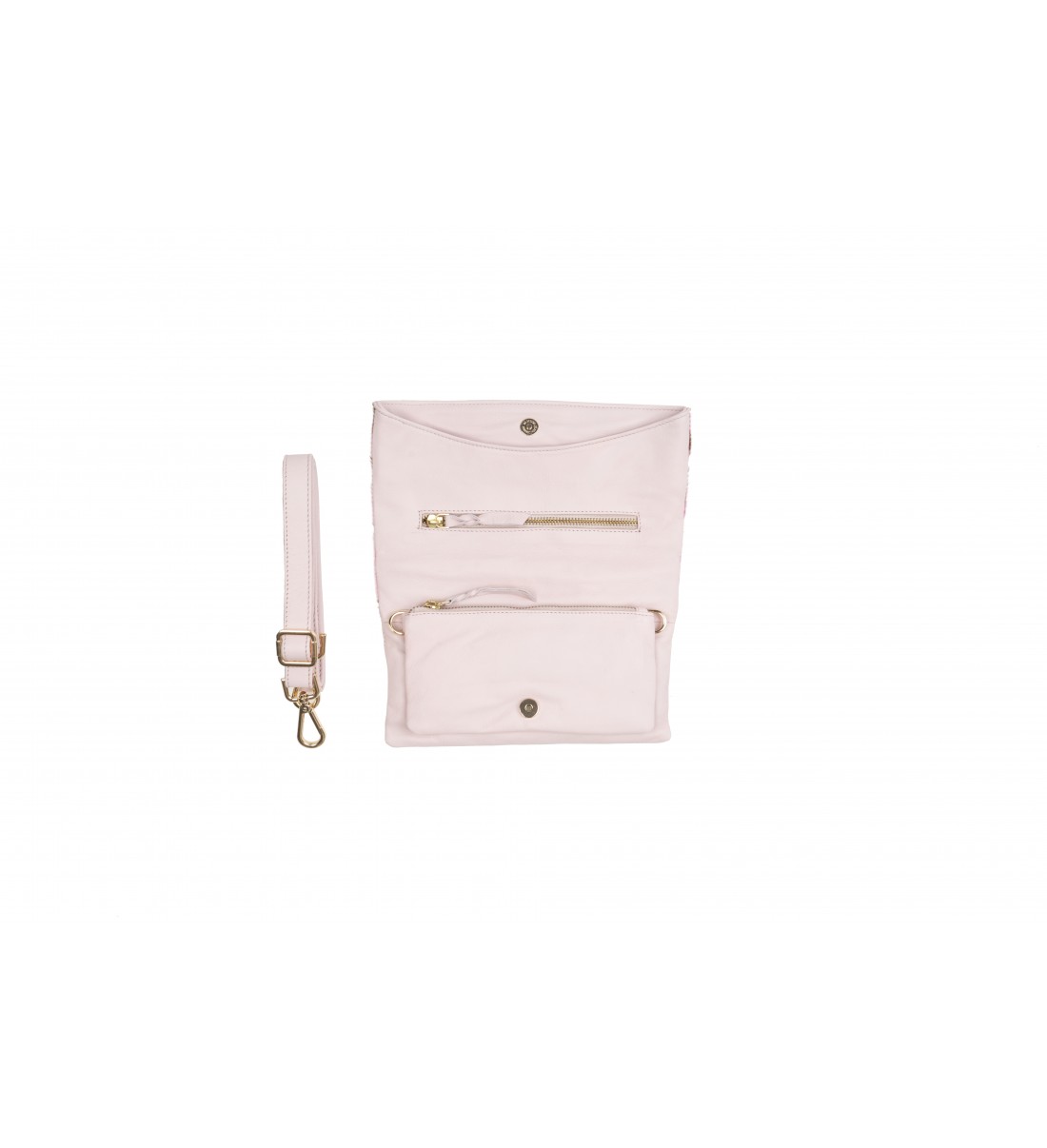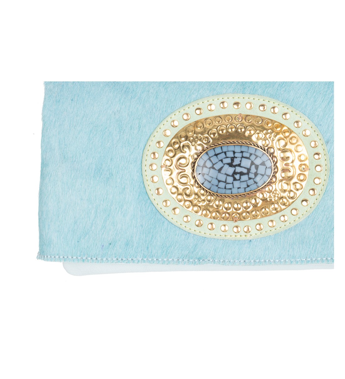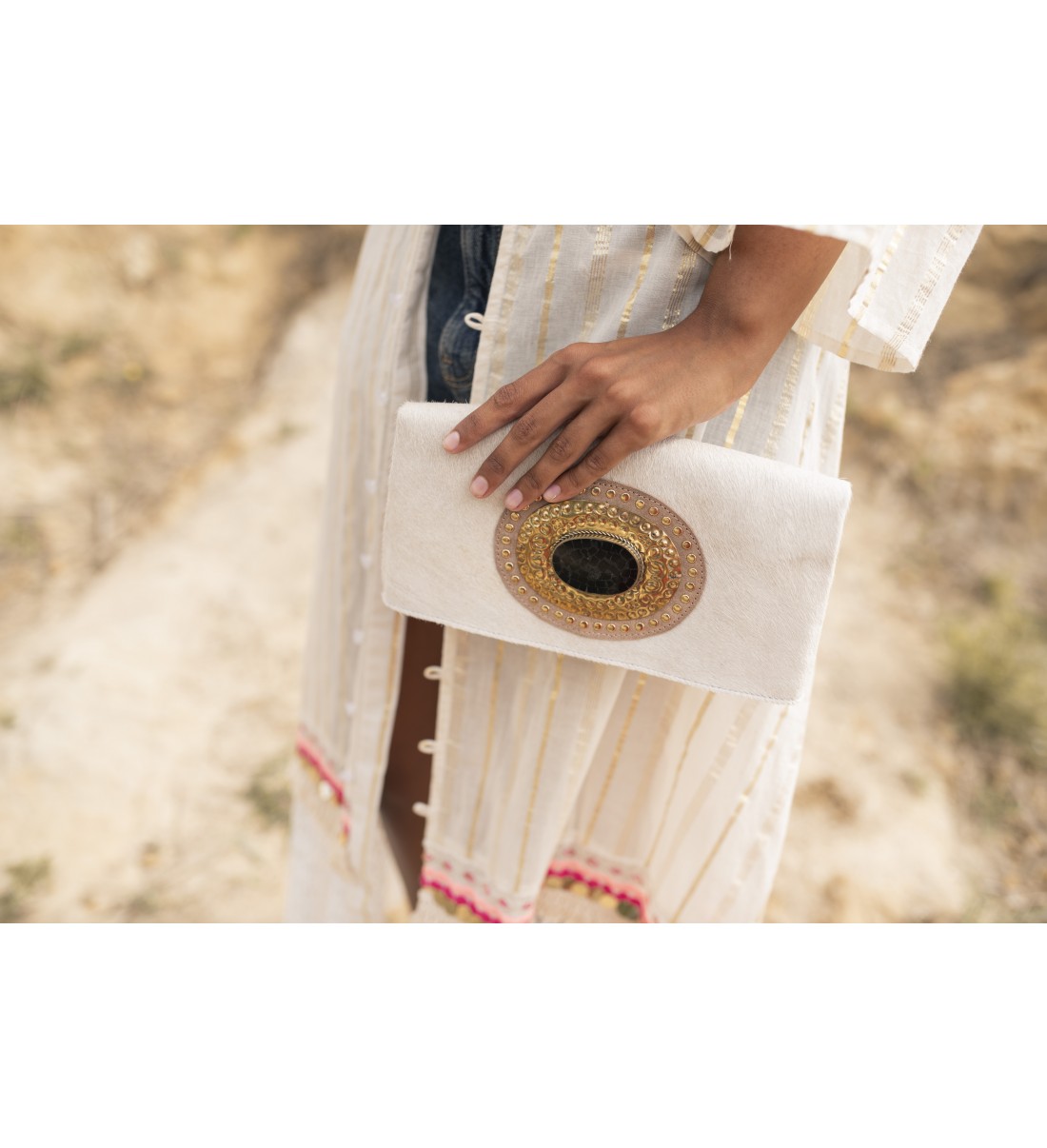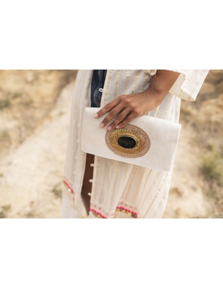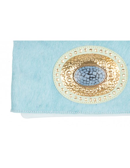 Pertenece a la colección AMA. Modelo con piedra y aplique metálico labrados a mano en el frente con detalle de tachas. Cierre con imán. Posee tres compartimentos, dos de ellos con cremallera. Incluye asa regulable y extraíble.